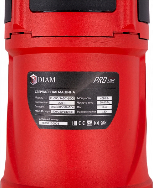 Установка алмазного бурения Diam PL-500/3ADC-1000 (Диам ПЛ-500/3АДЦ-1000) – мощная трехскоростная алмазная сверлильная машина с наклонной стойкой для сверления отверстий в бетоне и железобетоне, кирпичной кладке и других строительных материалах Ø 50 – 500 мм, под углом до 180°, в строительстве, при электромонтажных работах, прокладке сантехнических и вентиляционных труб, отбора проб грунта, высверливании проемов в стенах, а также для частного ремонта.