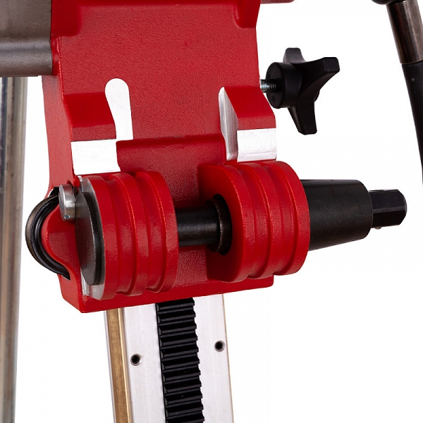 - Алюминиевая колонна со стальным основанием и электродвигатель, закрепленный на рабочей каретке с быстросъемным креплением "ласточкин хвост", которая перемещается по стойке с помощью стальной зубчатой рейки